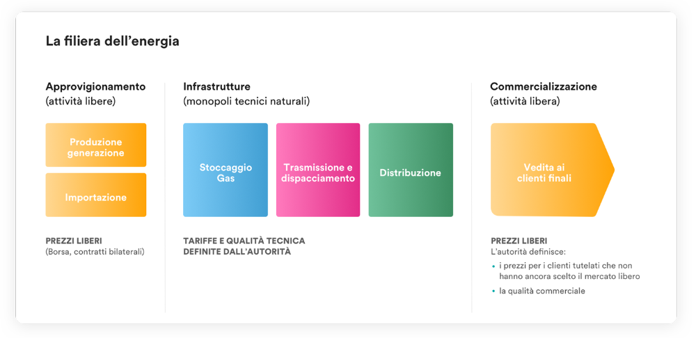 Pertanto le attività della distribuzione e della vendita di gas e di energia elettrica sono separate, e le società di vendita e le società di distribuzione operano nel mercato energy distintamente con obiettivi e attività diverse.