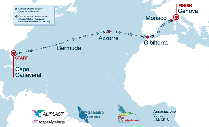 La barca partirà da Cape Canaveral (Florida) e affronterà un viaggio attraverso l’Oceano Atlantico, che la porterà a toccare le coste della Florida, delle Bahamas, delle Azzorre e del Portogallo, per arrivare nel Mediterraneo passando per lo Stretto di Gibilterra e attraccare definitivamente a Genova verso fine luglio.