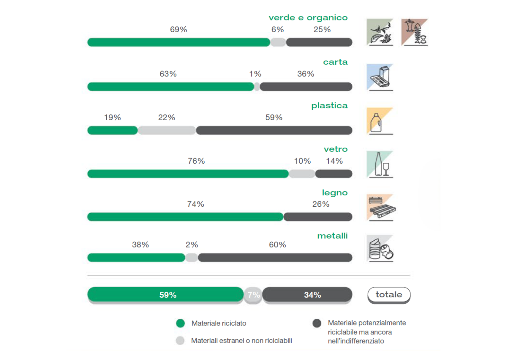 Tutti i dati sono riferiti al recupero di materia da rifiuti urbani e assimilati raccolti in modo differenziato. Per la plastica è stata considerata anche la quantità avviata a recupero energetico. Per riciclare la plastica infatti è necessario separare i singoli polimeri: vengono selezionati i principali (Pet, Pe, Pp) e generati scarti difficilmente riciclabili dai quali è però possibile recuperare energia.