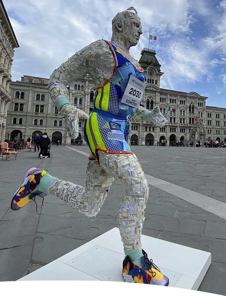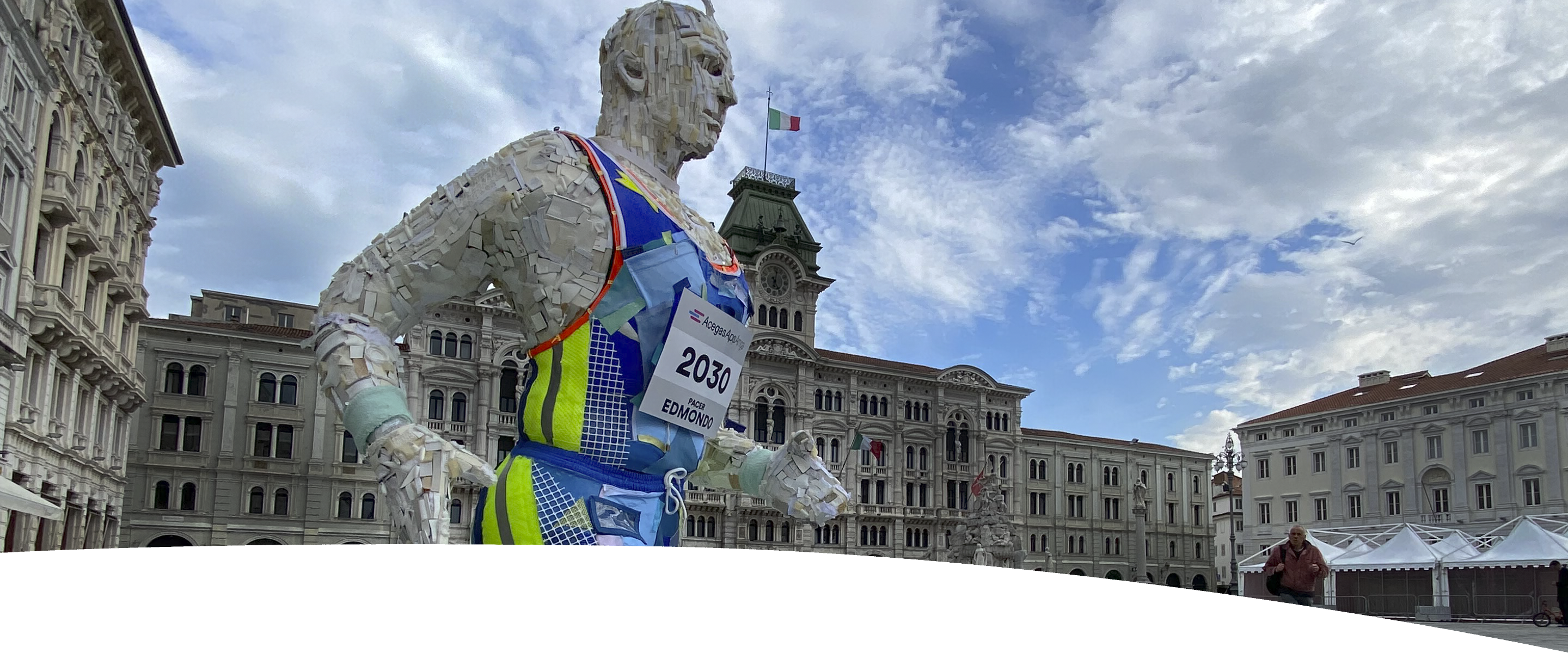 Ti presentiamo “Edmondo”, corre per portare un messaggio di sostenibilità e divulgare la cultura del riciclo. Con una sorta di ambasciatore di valori, AcegasApsAmga ha voluto rappresentare il proprio impegno. L’opera è stata realizzata da SCART e dagli studenti dell’Accademia delle Belle Arti di Firenze. Edmondo è un runner pacer, realizzato con materiali di recupero provenienti dal mondo dello sport.